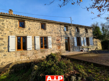 Cette maison de pierre, à rénover, offrant sur 100m² habitable : une pièce de vie de 36m², avec poêle à bois, ouverte sur une cuisine de 20m², 2 chambres (18m² et 14.5m²) et 2 salles d’eau avec WC.
